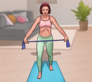 Posture : pour réaliser cet exercice, tu devras utiliser une bande élastique pour te soutenir afin de renforcer tes bras et ton dos. Mets-toi debout, une jambe devant l’autre. Le genou de la jambe avant doit être légèrement fléchi. Tiens la bande élastique devant toi.