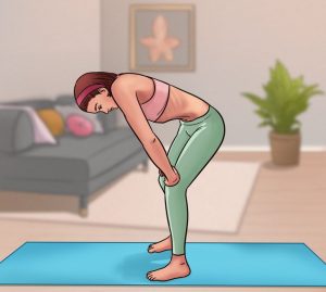 Posture : tiens-toi debout, pieds parallèles, les genoux légèrement fléchis, et place tes mains par-dessus afin de les soutenir, tout en essayant de courber ton dos vers l’avant.