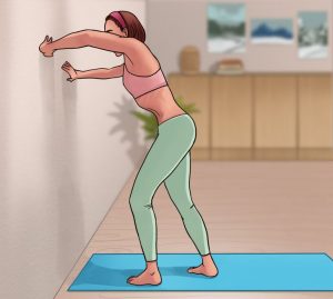 Posture : tiens-toi debout face à un mur, place une jambe devant l’autre, et plie légèrement les genoux. Appuie tes mains sur le mur comme si tu voulais le pousser, en veillant à ce que tes doigts soient tournés vers l’intérieur, afin que les muscles de tes bras soient également sollicités.