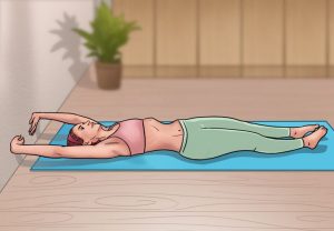 Posture : allonge-toi par terre ou sur un tapis, le corps bien droit et les pieds alignés au niveau des hanches. Lève les bras en essayant de t’étirer, en faisant en sorte que tes doigts se regardent. Tu peux appuyer les mains sur un mur pour t’aider.