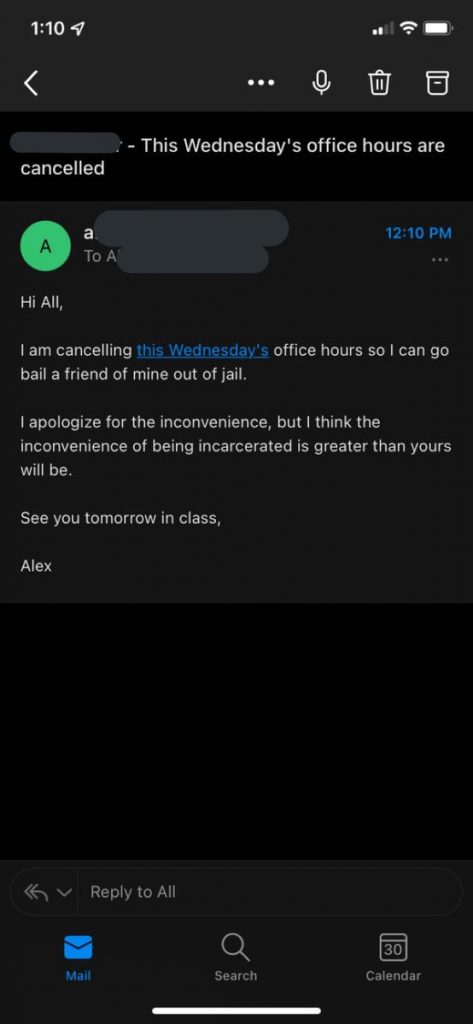 « Bonjour à tous, j’annule les heures de cours de ce mercredi afin que je puisse faire sortir un ami de prison. Je m’excuse pour cet inconvénient, mais je pense que l’inconvénient d’être incarcéré est plus grand que ne sera le vôtre. »