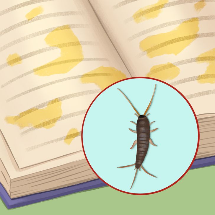 Cela peut être le signe d’une infestation de lépismes. Ces petits insectes se nourrissent du sucre et de l’amidon du papier, d’où les taches jaunes qu’ils laissent sur les livres, les documents, les papiers peints, etc.