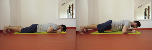 La position de départ est allongée sur le ventre, les bras pliés vers le corps et les jambes reposant sur les orteils.